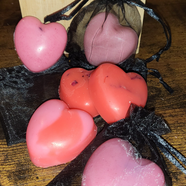 "Plongez dans une expérience de tendresse avec ces fondants parfumés envoûtants, façonnés en cœurs délicats. Chaque pièce recèle de somptueux pétales de roses, comme une promesse d’amour glissée au creux d’un parfum captivant. Les teintes rouge passion, rose caresse et bicolores séduisantes s’accordent à l’élégance des pochons noirs en organza, sublimant chaque détail de cet instant d'amour et de tendresse.