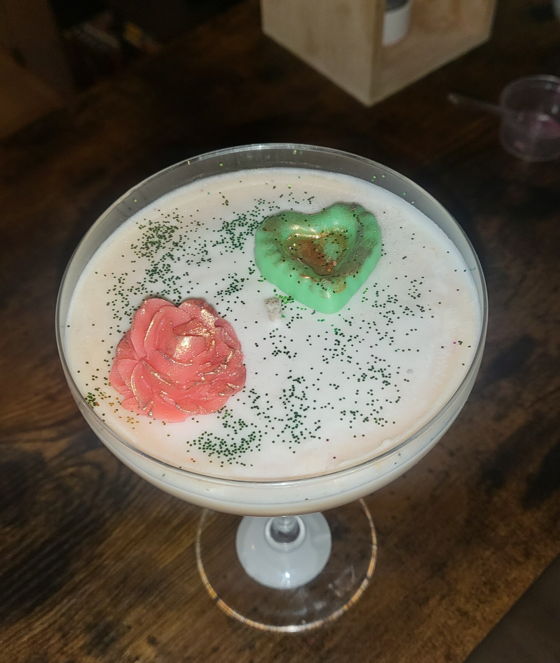 Découvrez notre bougie de luxe "My Love", spécialement conçue pour l’édition Saint-Valentin. Coulée dans un élégant verre à pied à cocktail, elle allie raffinement et romantisme. Au sommet, un magnifique cœur et une rose en fondant trônent fièrement, ajoutant une touche d’amour et de tendresse à ce chef-d’œuvre artisanal. Cette bougie incarne parfaitement l’amour et la passion, idéale pour un moment intime ou comme cadeau mémorable.