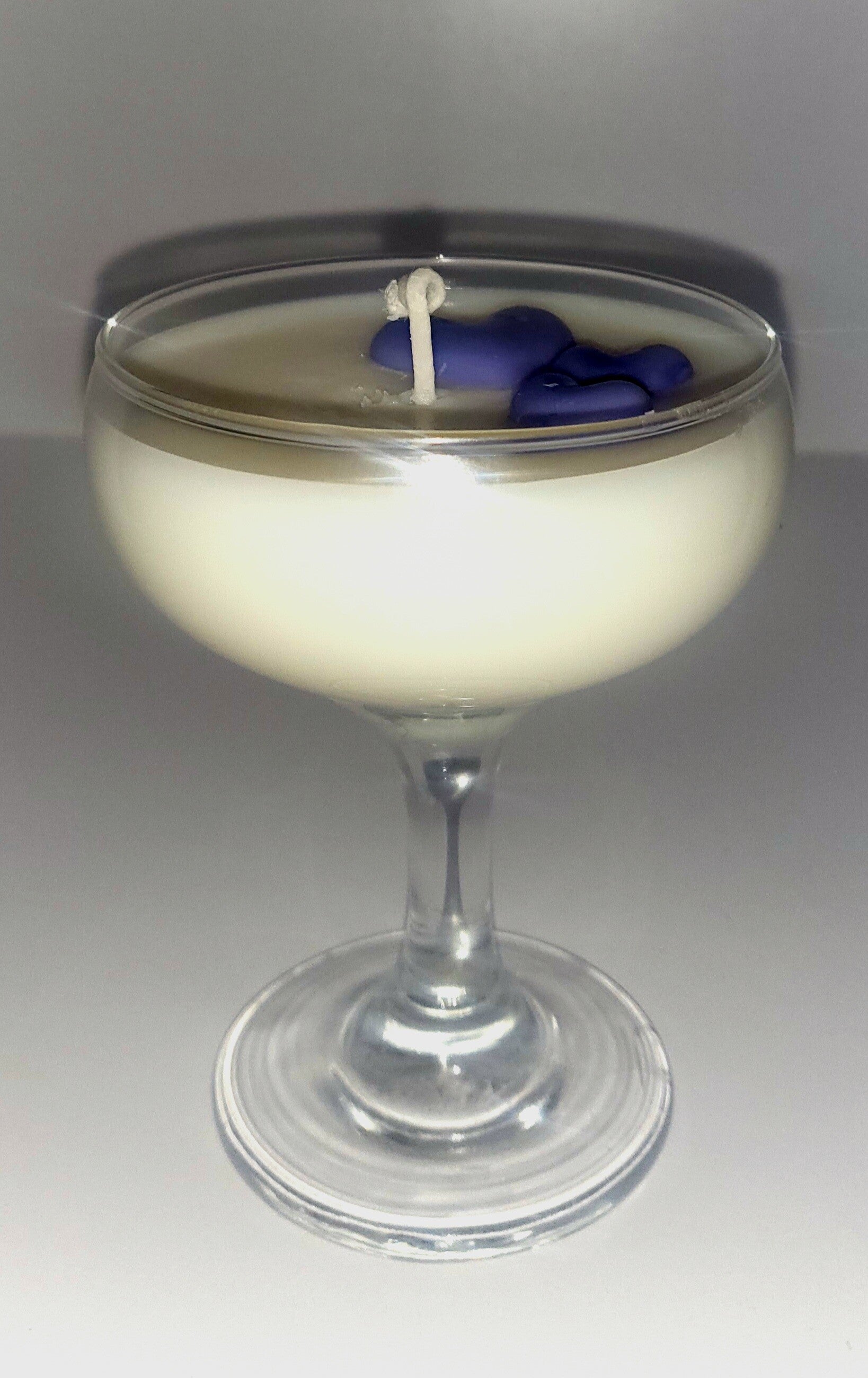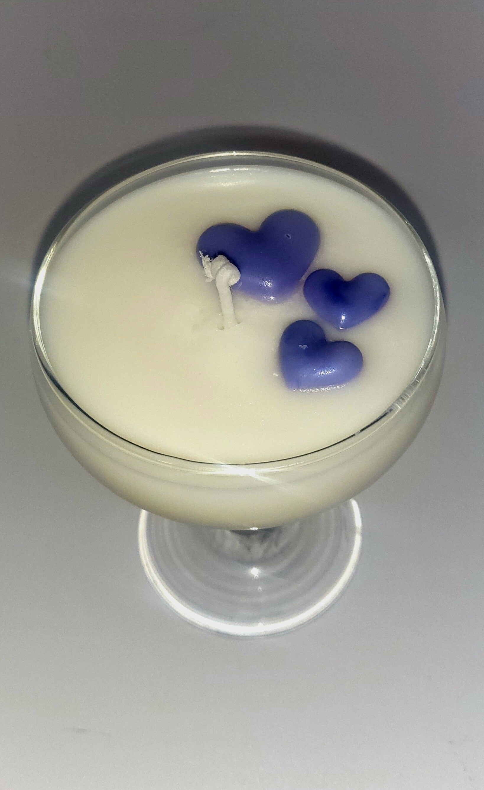 Découvrez nos bougies inspirées des plus belles fragrances, élégamment coulées dans des verres à pied, avec un petit fondant parfumé sur le dessus .