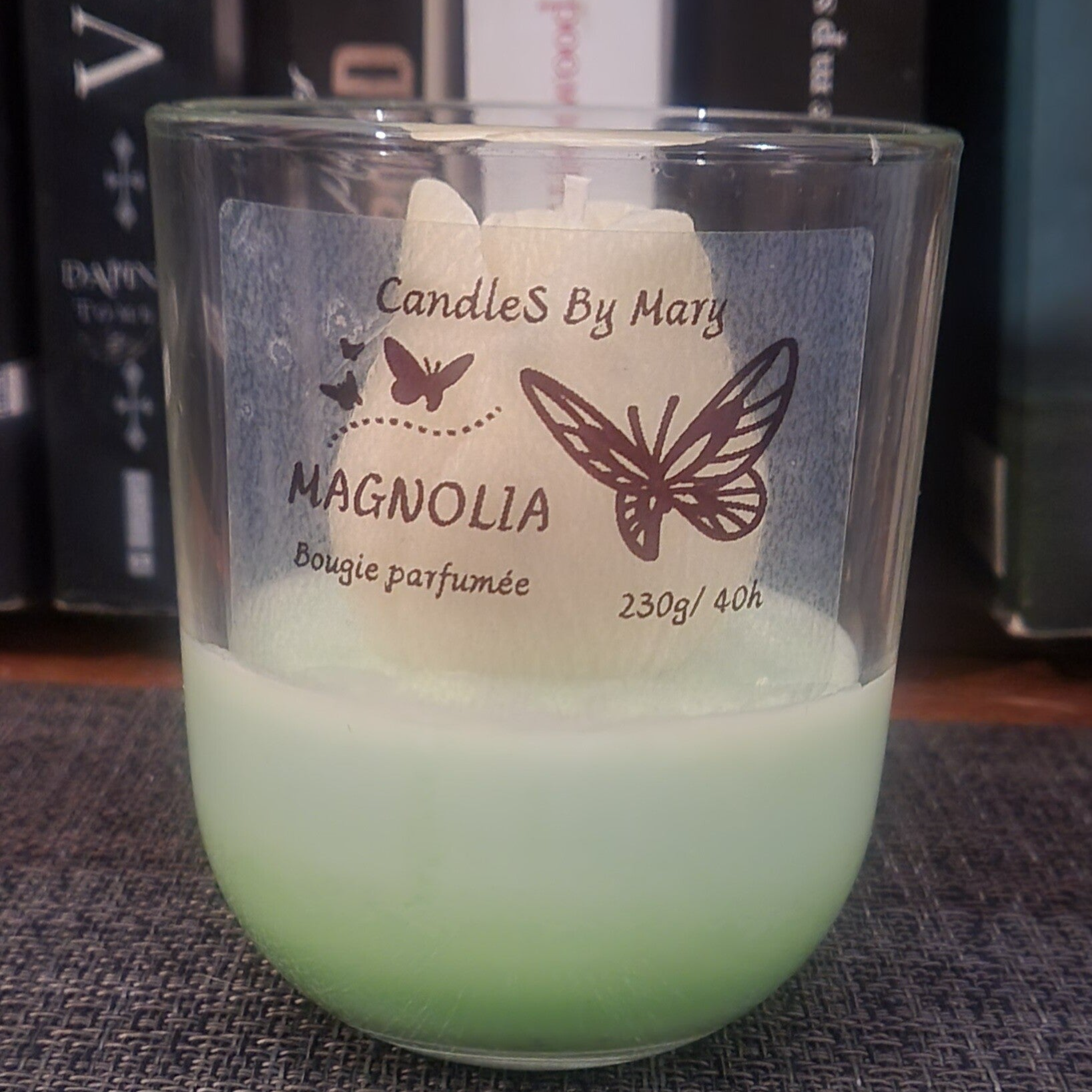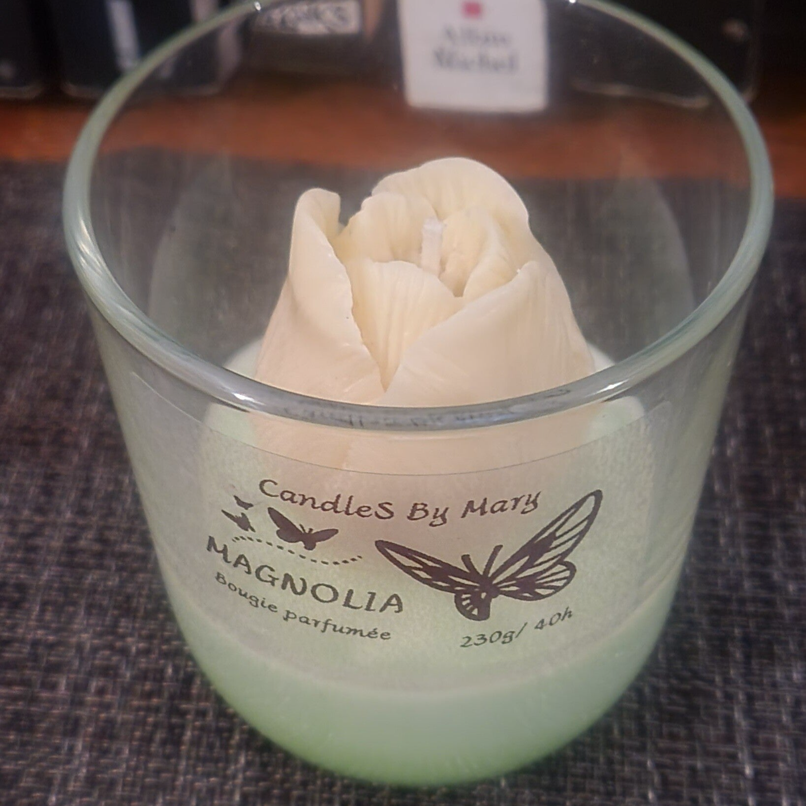 🌿 Magnolia – Une bougie élégante sur une base de cire de coco teintée au mica vert, surmontée d’un bourgeon de tulipe en cire, délicatement parfumée à la fragrance Magnolia de Grasse.
