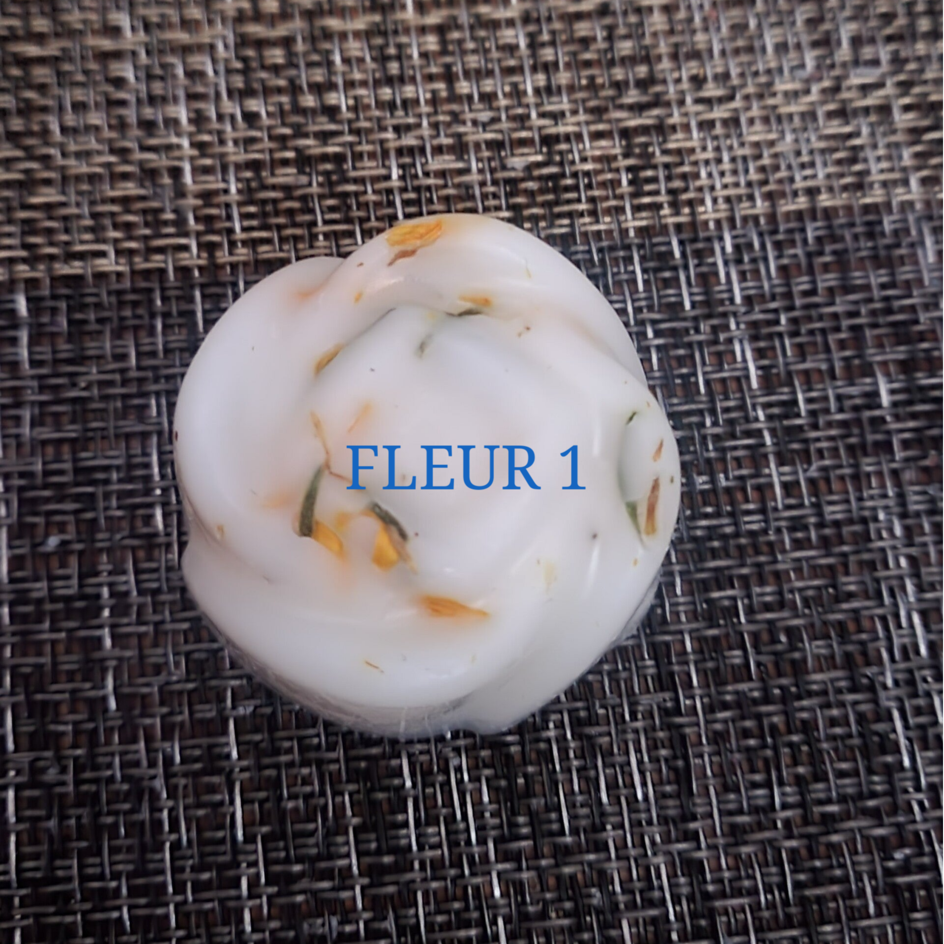 cire de soja, fragrance de grasse sans CMR dosée à 10%, pigments poudre de mica, fleurs séchées.