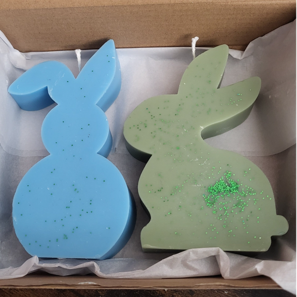 Craquez pour ces adorables bougies artisanales en forme de lapins, déclinées en trois couleurs pastel : bleu ciel, vert tendre et blanc crème. Chaque bougie est parsemée de petites paillettes pour un effet scintillant tout doux.