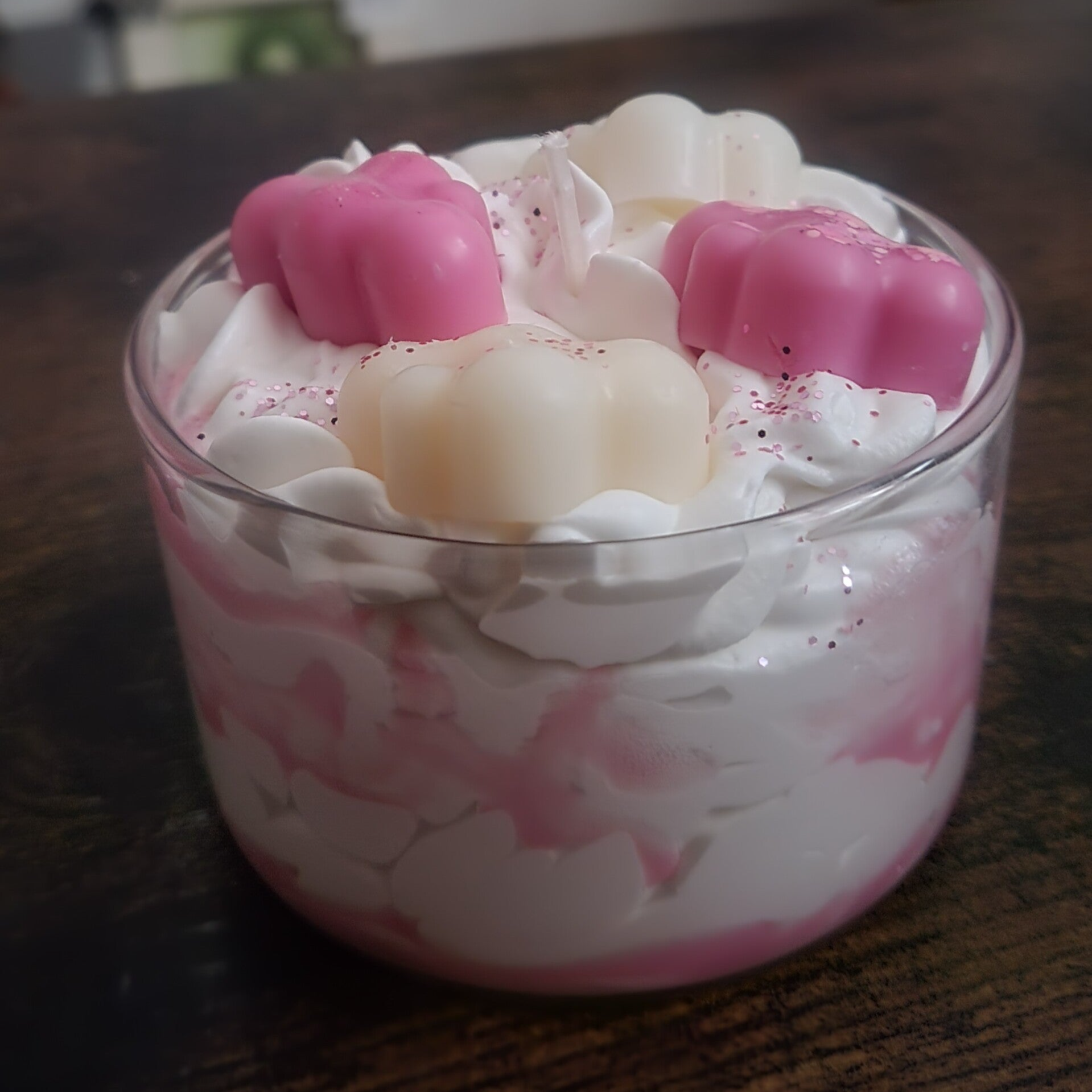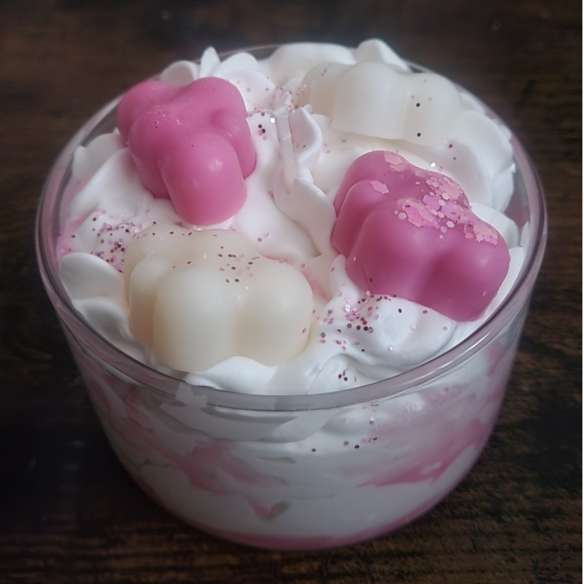 Offrez-vous un moment de douceur absolue avec notre bougie chantilly Au-dessus des Nuages en version rose. Entièrement faite à la main, elle associe la gourmandise visuelle à la délicatesse olfactive. Sa base fouettée façon crème chantilly est surmontée de petits nuages en fondant, dans des teintes rose et blanc, saupoudrés de paillettes pour une touche féerique.