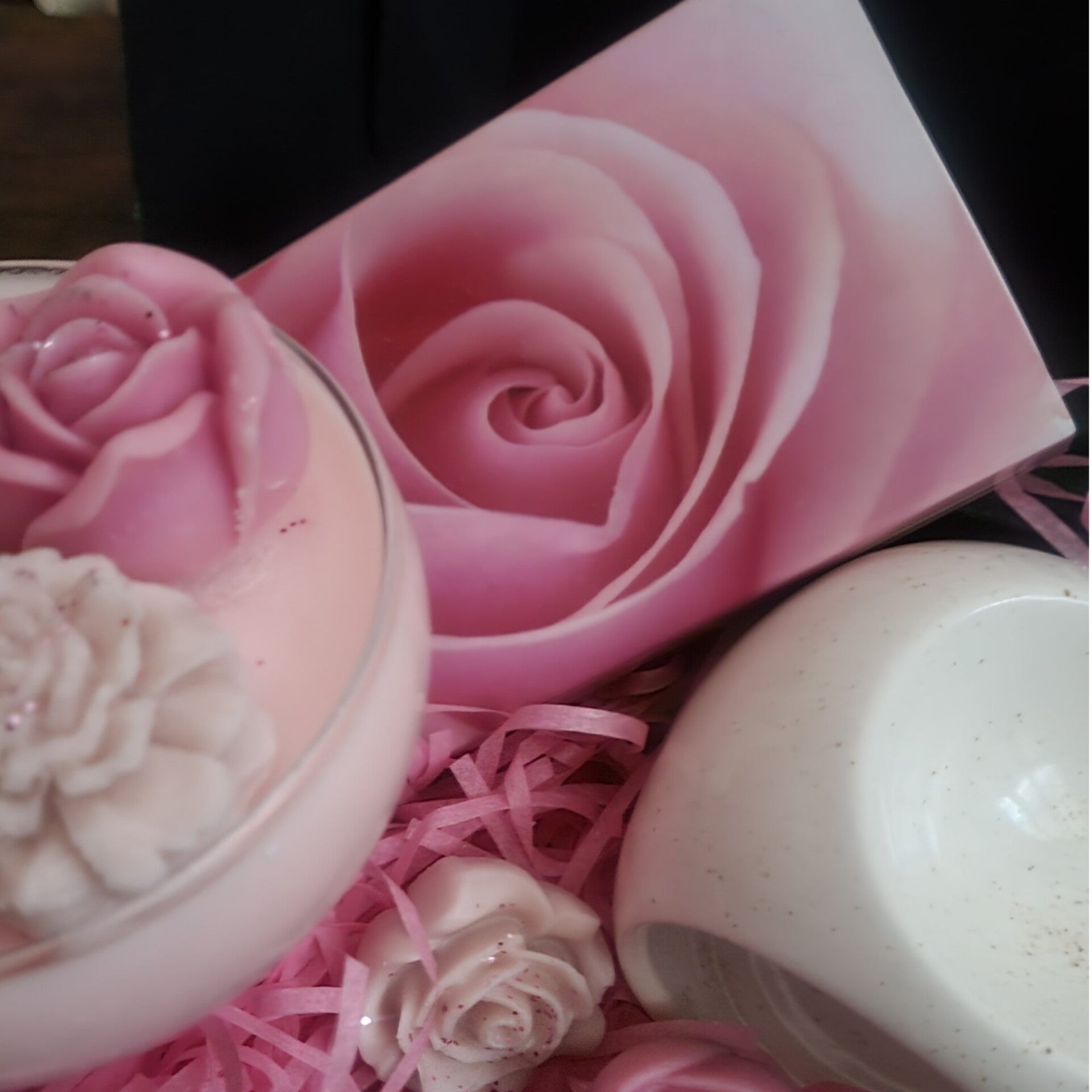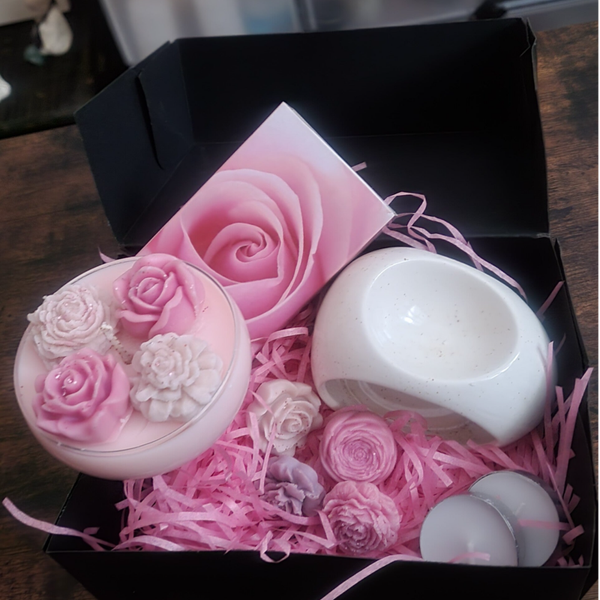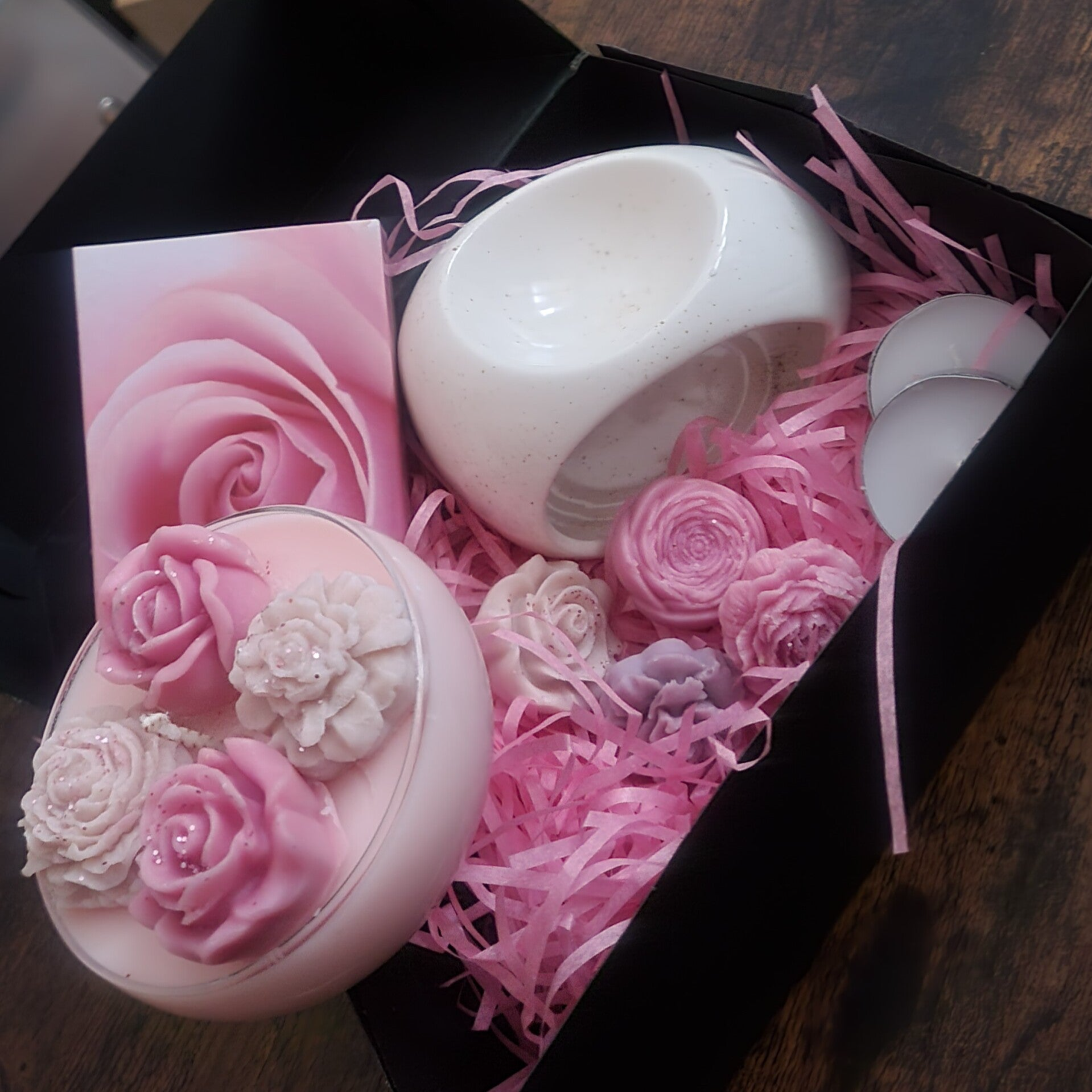 Une bougie coulée dans un élégant verre à pied, décorée de 4 fleurs de fondant parfumé à retirer délicatement pour les faire fondre dans le brûleur vintage inclus dans le coffret.