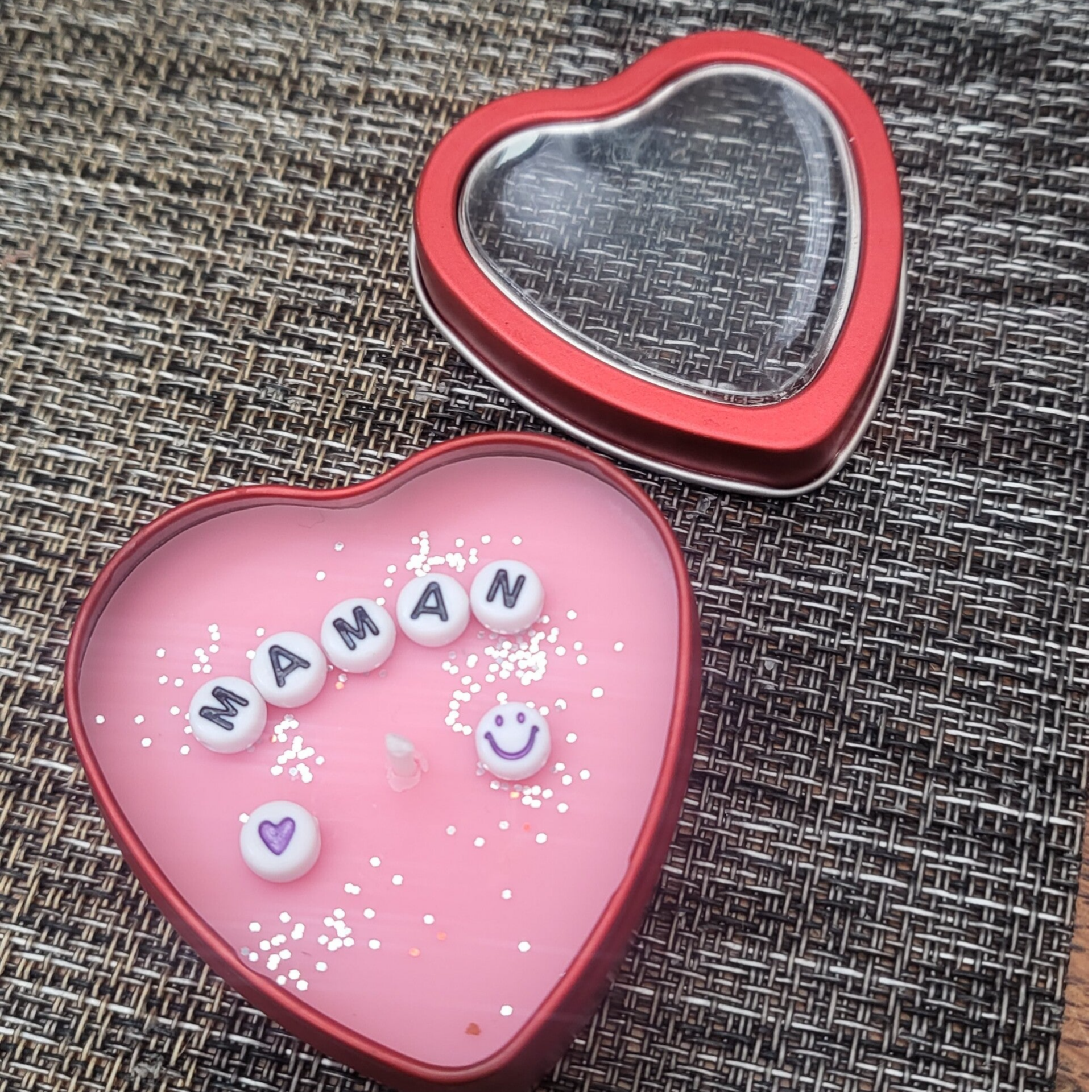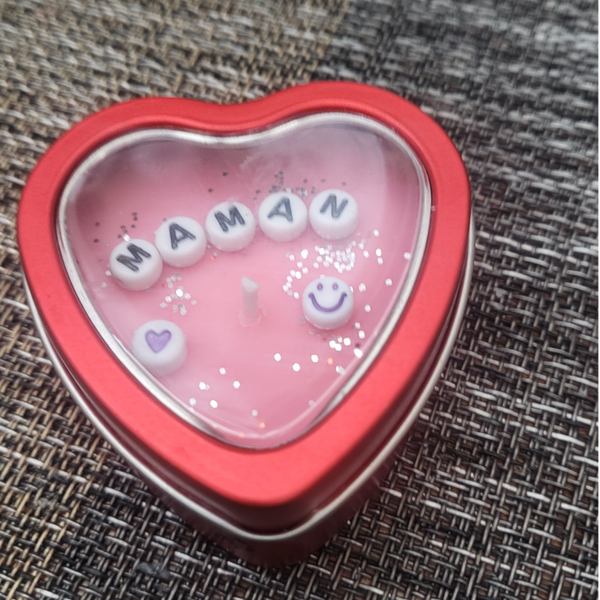Surprise ! En son centre, de petites lettres en cire forment le mot MAMAN, accompagnées d’un petit cœur et d’un émoji souriant. Un joli clin d’œil qui se révèle au fil des minutes, comme un secret réservé à celle qui la fait brûler.