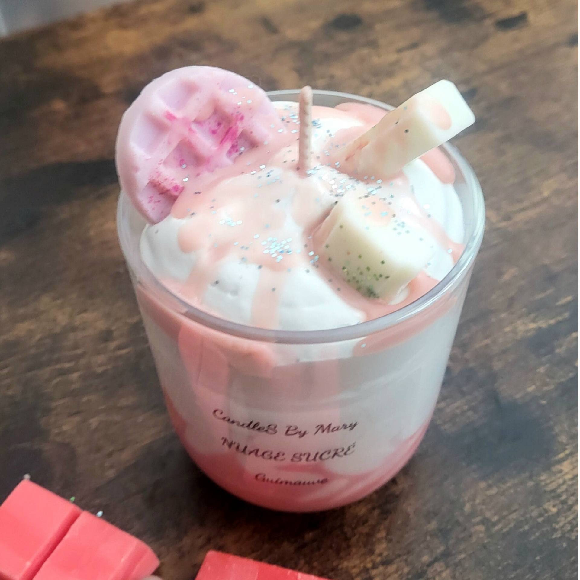 Un véritable délice visuel et olfactif ! Cette bougie est une invitation à la gourmandise, avec ses notes sucrées de guimauve, son topping façon chantilly, ses décos roses pastels et ses petits détails irrésistibles (gaufrette, bonbons, carré fondant…).