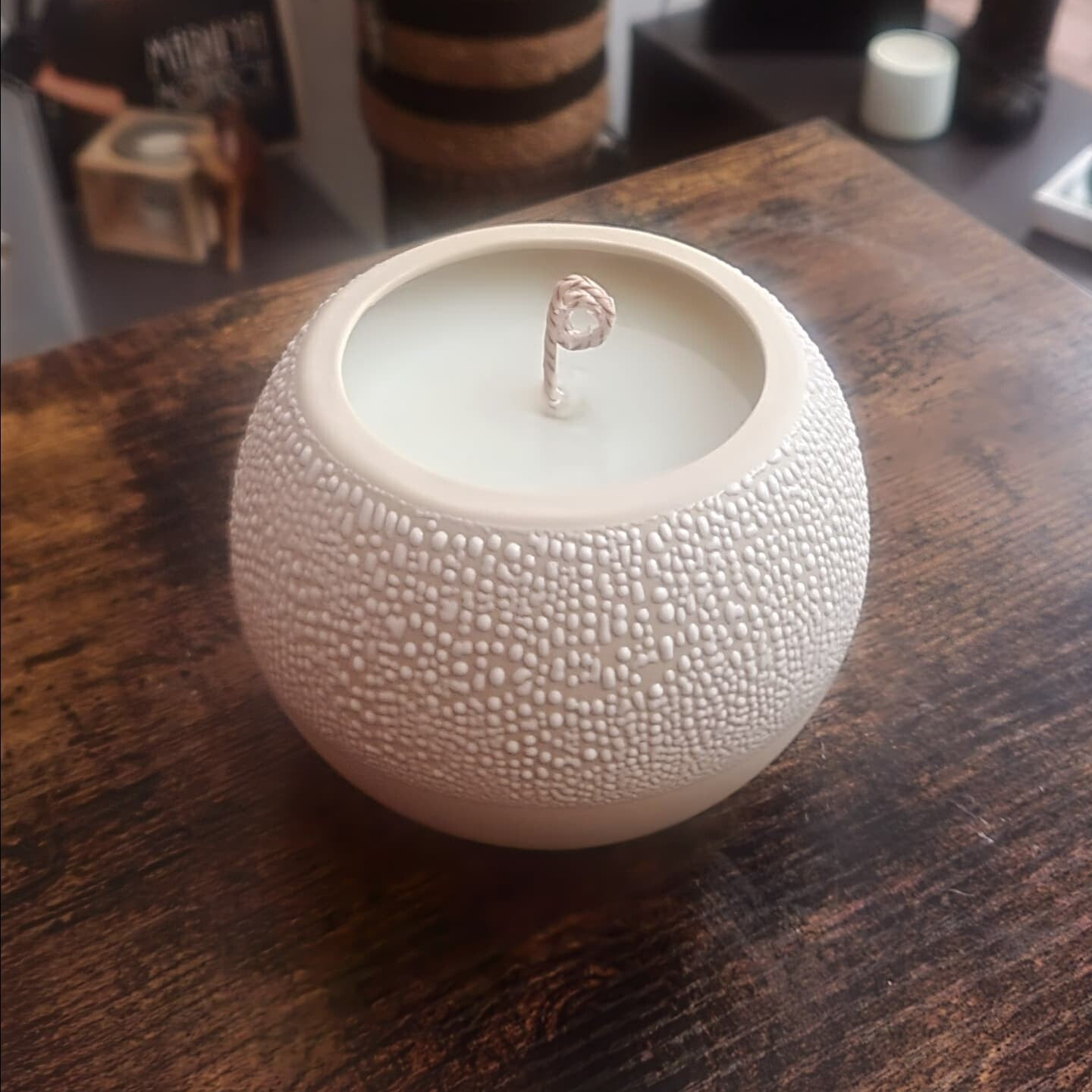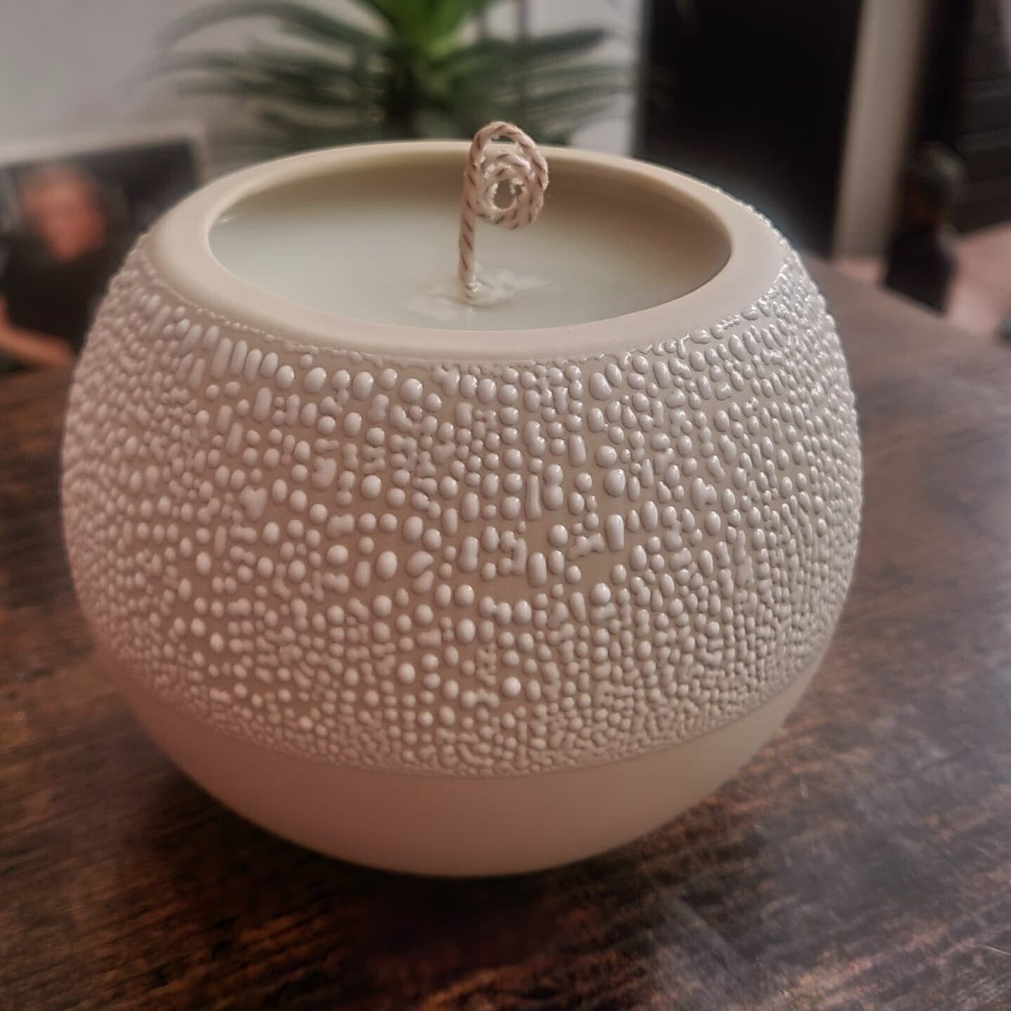 Coulée à la main dans un pot en céramique texturée à l’allure minérale, cette pièce unique invite à la sérénité et à l’ancrage, tout en apportant une touche de caractère à votre intérieur.