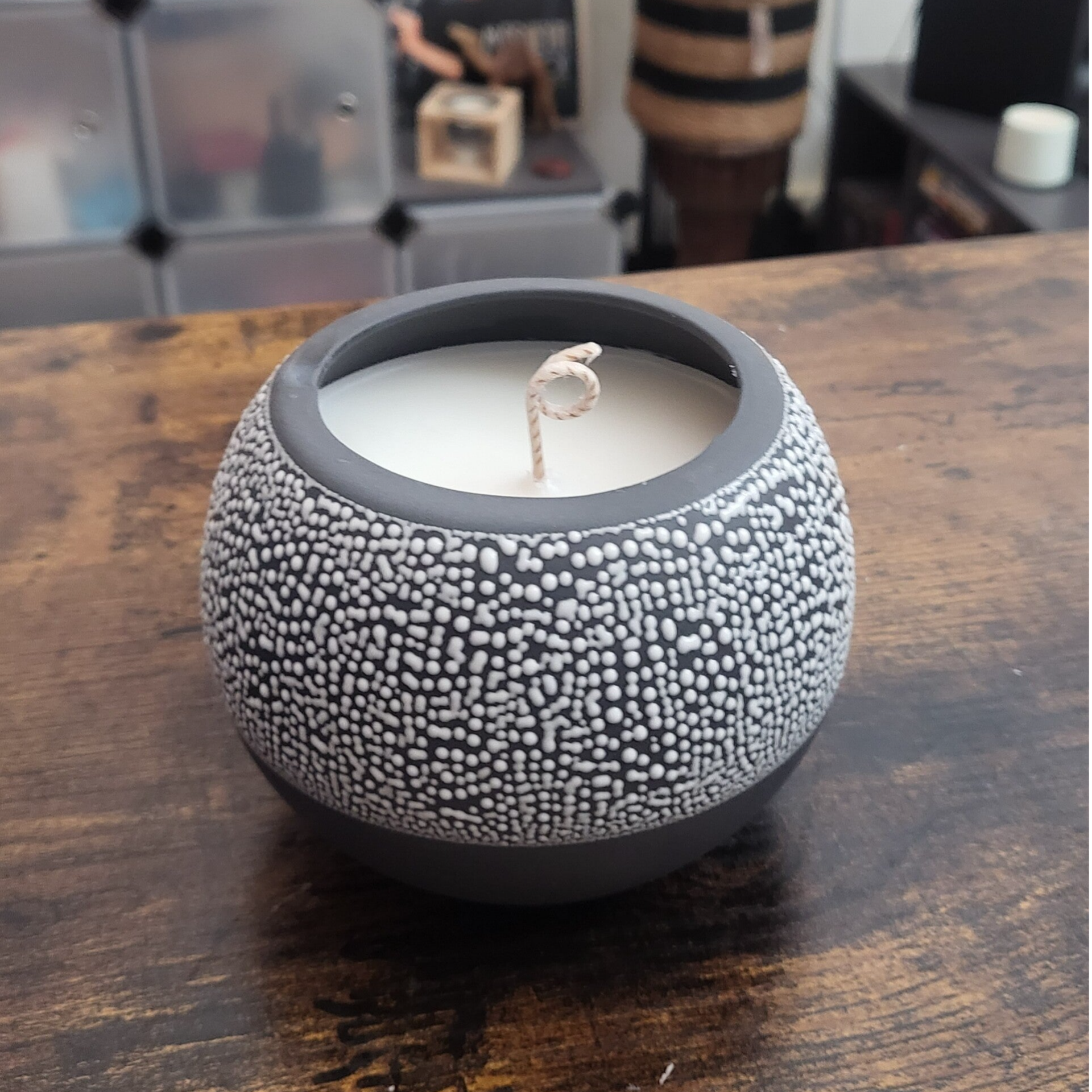 Coulée à la main dans un pot en céramique texturée à l’allure minérale, cette pièce unique invite à la sérénité et à l’ancrage, tout en apportant une touche de caractère à votre intérieur.