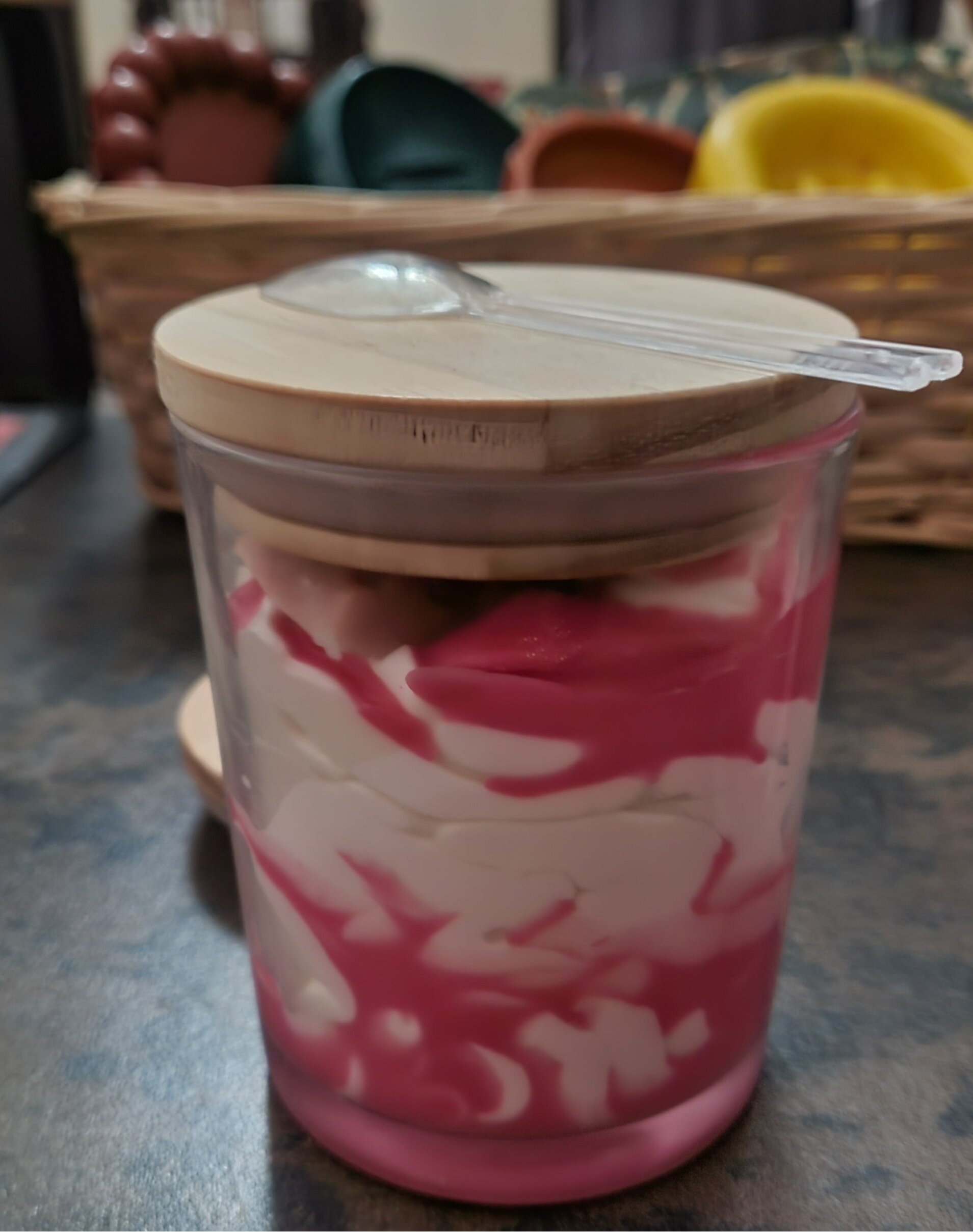 Chaque pot en verre est muni d’un couvercle bois élégant 🌿 et accompagné d’une petite cuillère pour prélever facilement la cire.