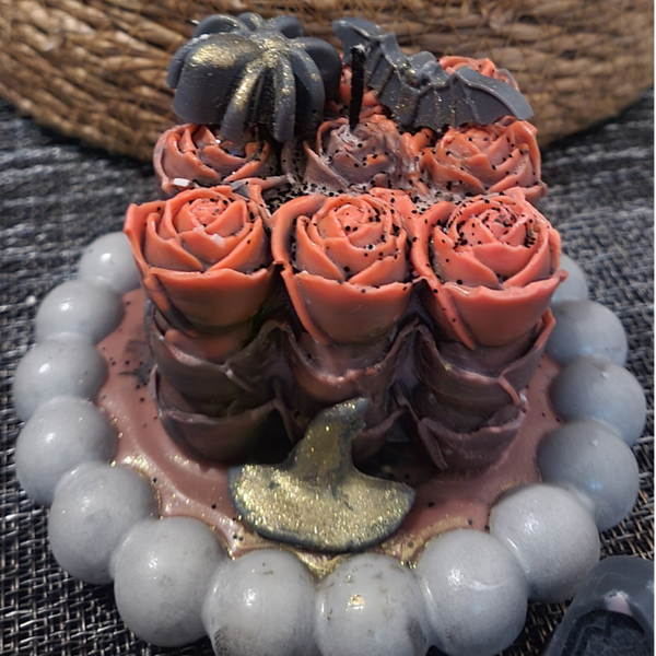 Une création mystérieuse et raffinée pour Halloween : la bougie Rose Nocturne est composée d’un bouquet de roses sculptées, teintées de noir et d’orange automnal, reposant dans un socle en aquarésine gris perle. Les décorations (chauve-souris, araignée, tombe miniature) viennent ajouter une touche gothique et inquiétante.